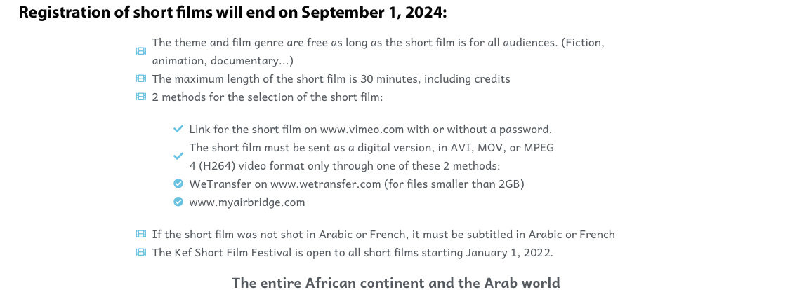 En cochant cette case vous acceptez tous les Termes et Conditions du Festival du Court au Kef pour 2024 By checking this box, you agree to all Termes and Conditions of the Festival du Court au Kef for 2024 بوضع علامة في الخانة، أنت موافق على أحكام وشروط مهرجان القصير بالكاف دورة 2024
